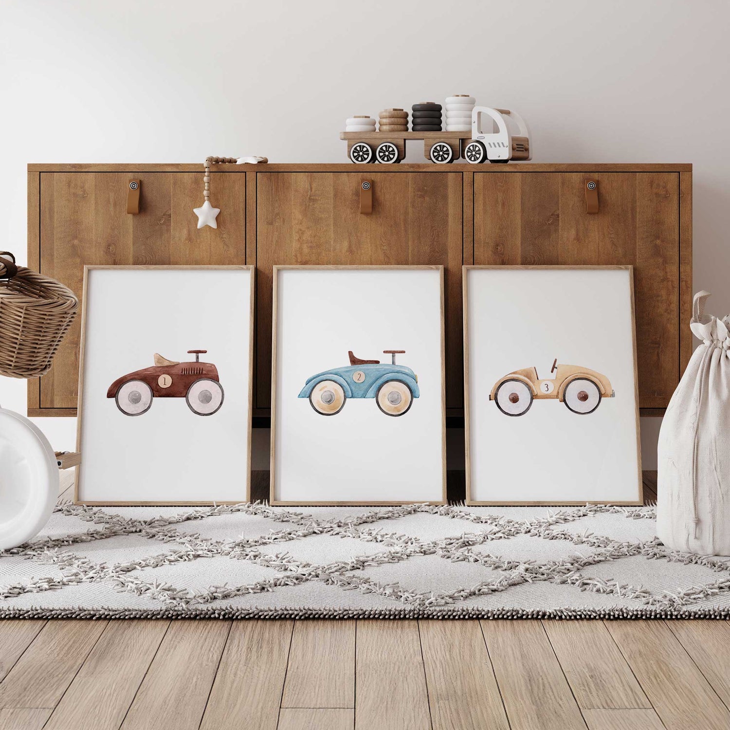 Add a touch of vintage charm to your little one's room with this set of three retro inspired car prints. Featuring classic style ride on cars in soothing shades of blue green or multi, this art set is perfect for boys nurseries, toddler bedrooms, or play spaces.