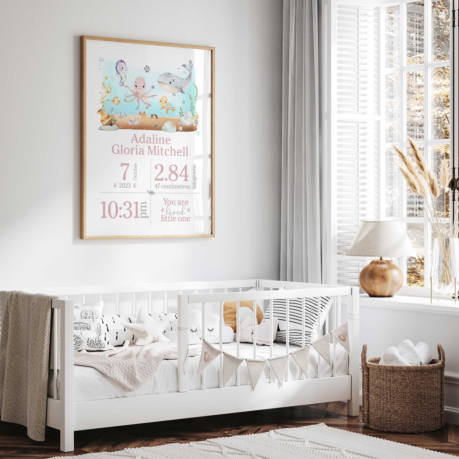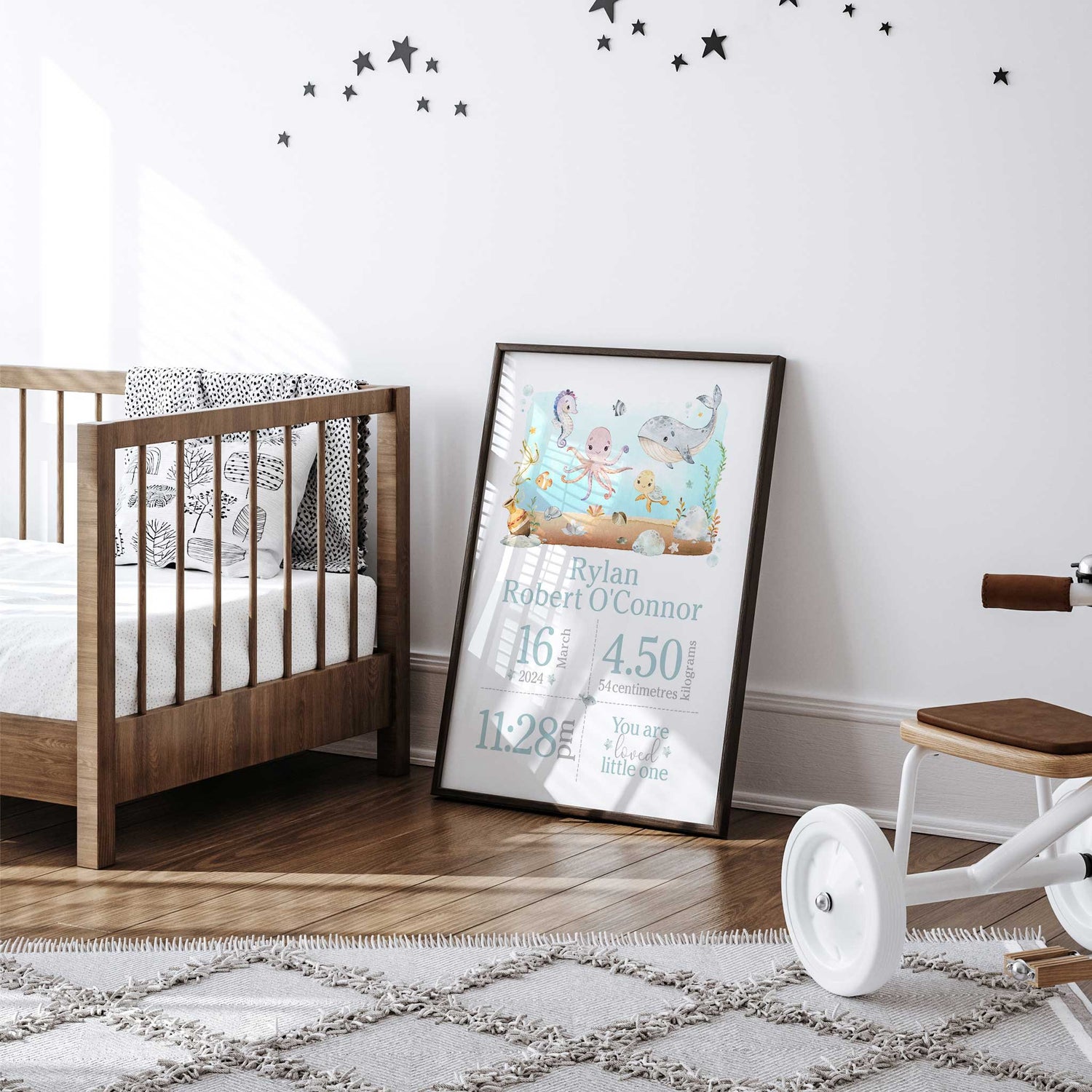 Celebrate your baby’s arrival with this sweet Under the Sea birth announcement print. Featuring gentle watercolour ocean animals and your child’s personalised birth details, it adds a soft coastal touch to nurseries and baby rooms.