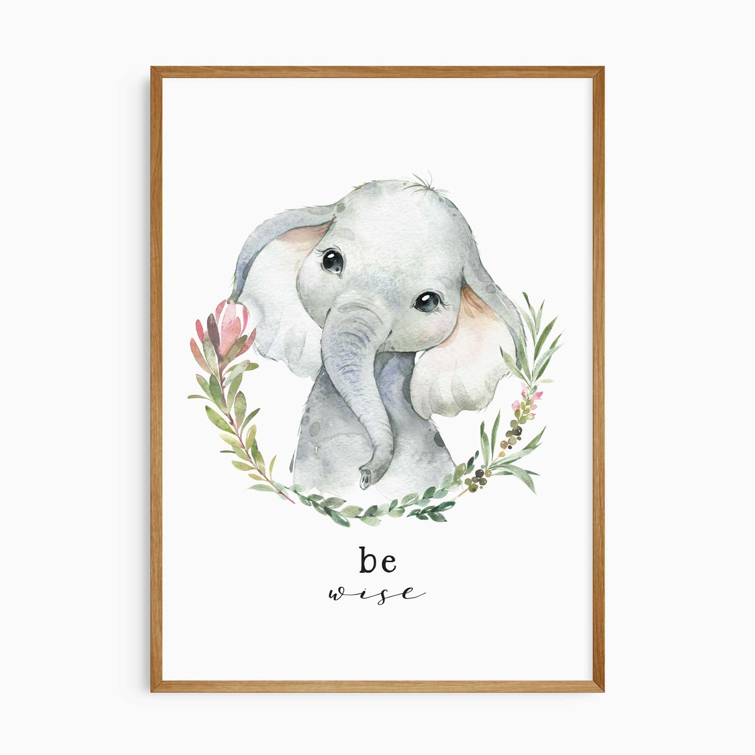 Create a soft safari nursery with this girls safari wall art set, designed especially for baby girls rooms. This gentle set of three features a zebra, lion cub, and elephant illustrated in a delicate watercolour style, surrounded by greenery with soft pink floral details.