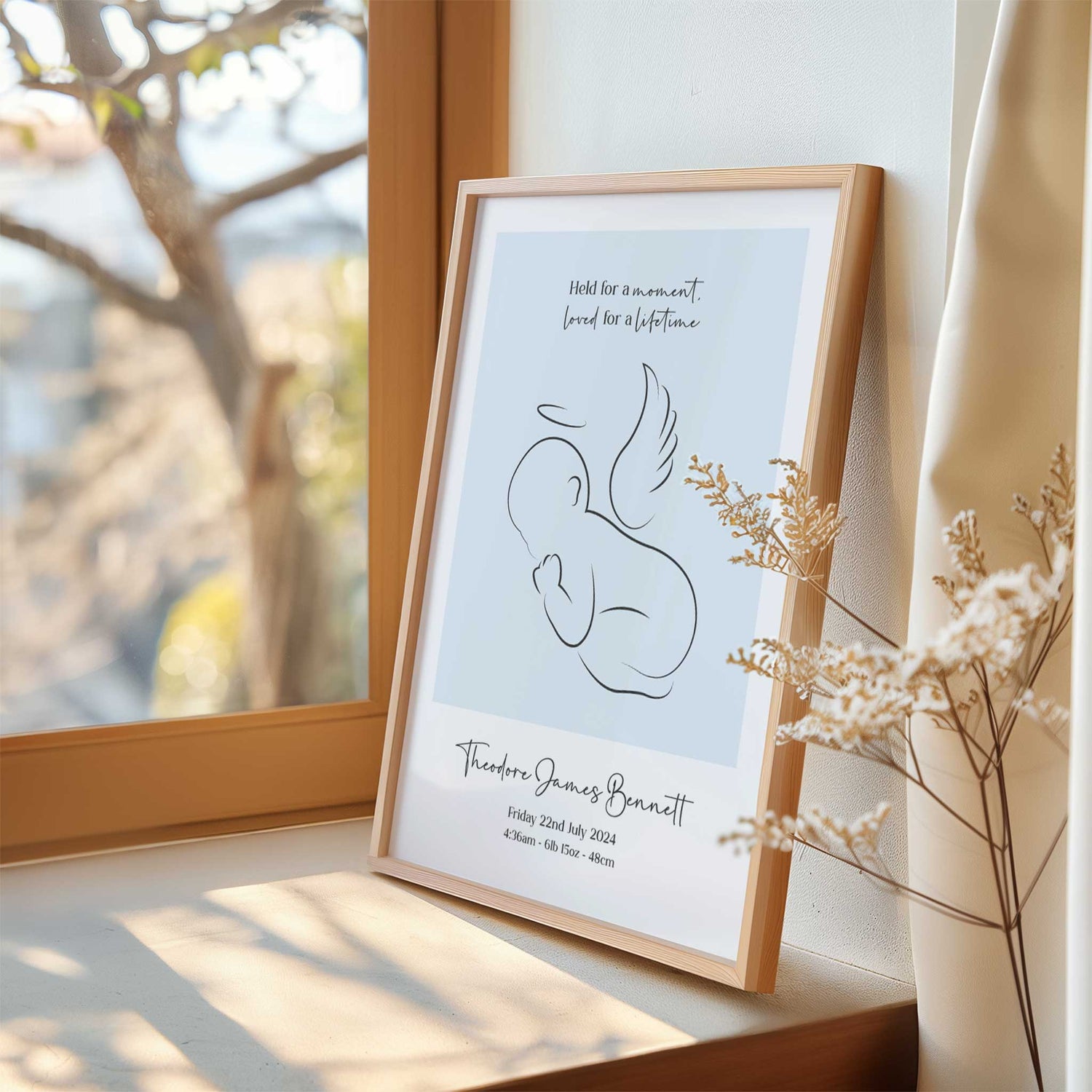 This personalised angel baby memorial print is a gentle keepsake created to honour and remember a precious little life. Featuring delicate line art, your chosen name and birth details, and a heartfelt quote, it is designed to bring comfort while creating a meaningful piece for the nursery or home. Available in soft pink or blue, it can be customised for a baby girl or boy.