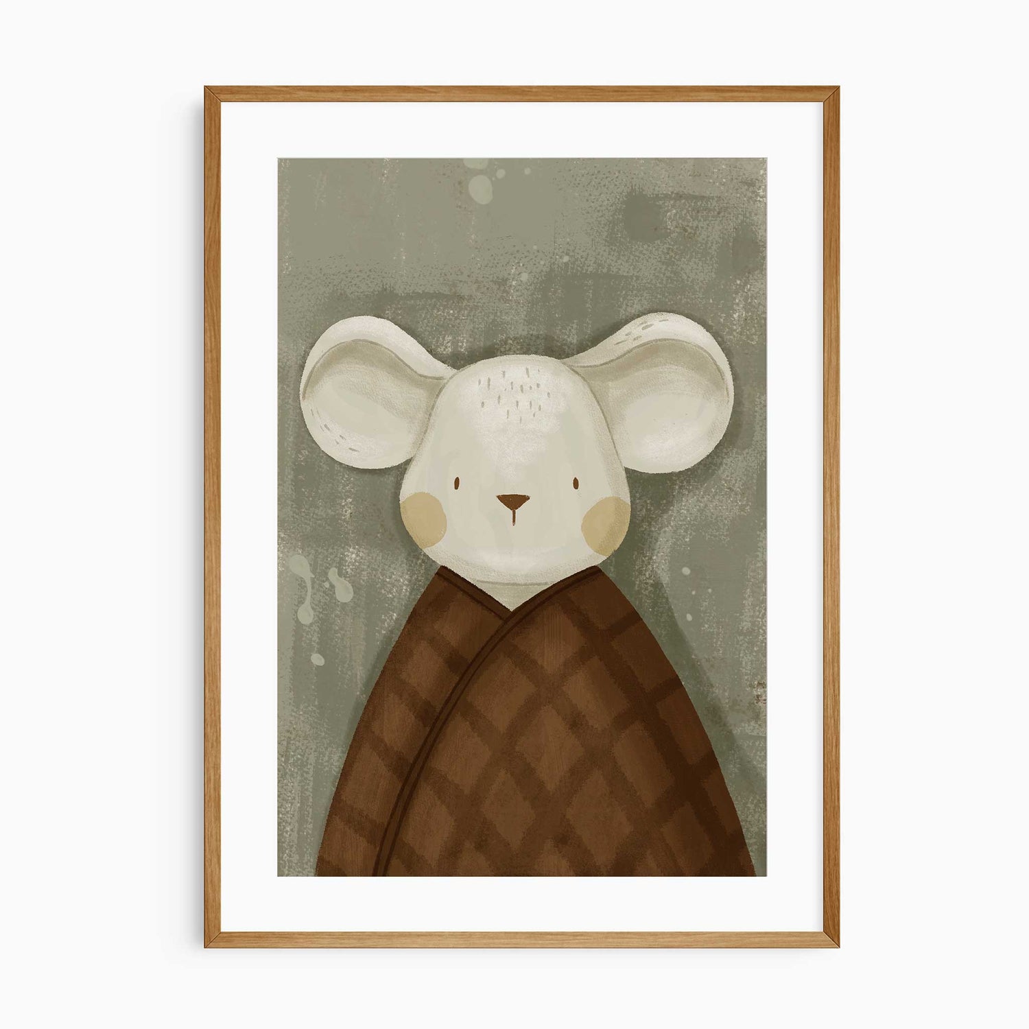This mouse wall art print is a lovely choice for a baby nursery, toddler bedroom or storybook-inspired playroom. The soft sage background and warm brown quilted wrap give it a calm, cosy feel, making it especially well suited to neutral nurseries, woodland themes and gentle animal room decor.