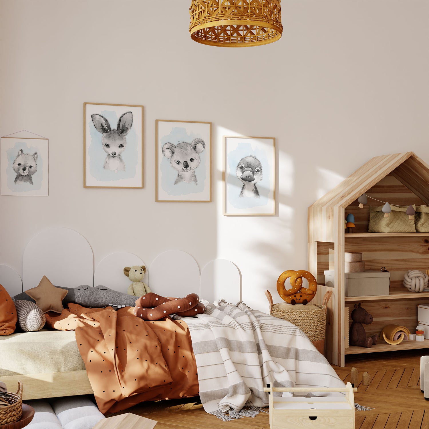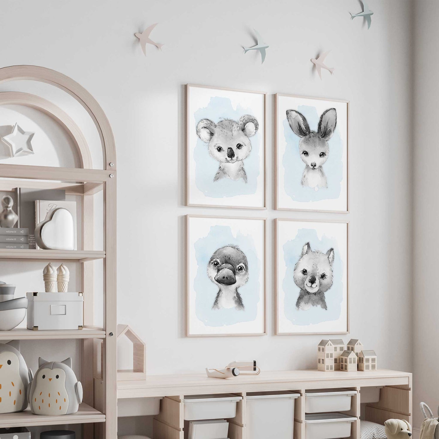 Create a calm and comforting nursery with this soft animal portrait wall art set, featuring a koala, kangaroo, platypus and wombat. Available in a choice of blue or pink watercolour backgrounds, this gentle set is perfect for baby bedrooms and kids spaces.