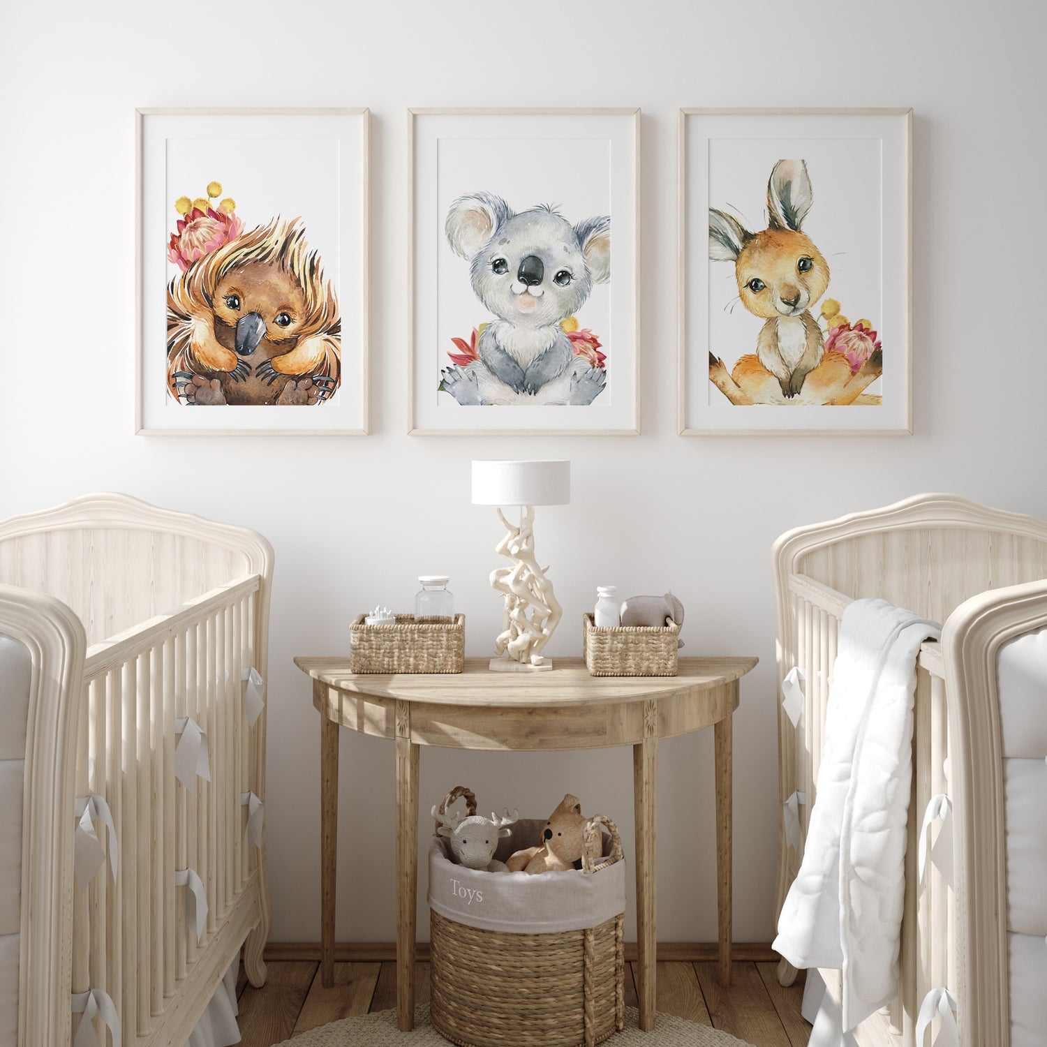 This sweet Australian animal wall art set features a baby echidna, koala and kangaroo illustrated in soft watercolour with warm earthy tones and native florals. Designed to bring gentle colour and personality into your nursery, these prints suit girls baby rooms, toddler bedrooms and modern Australian themed spaces.