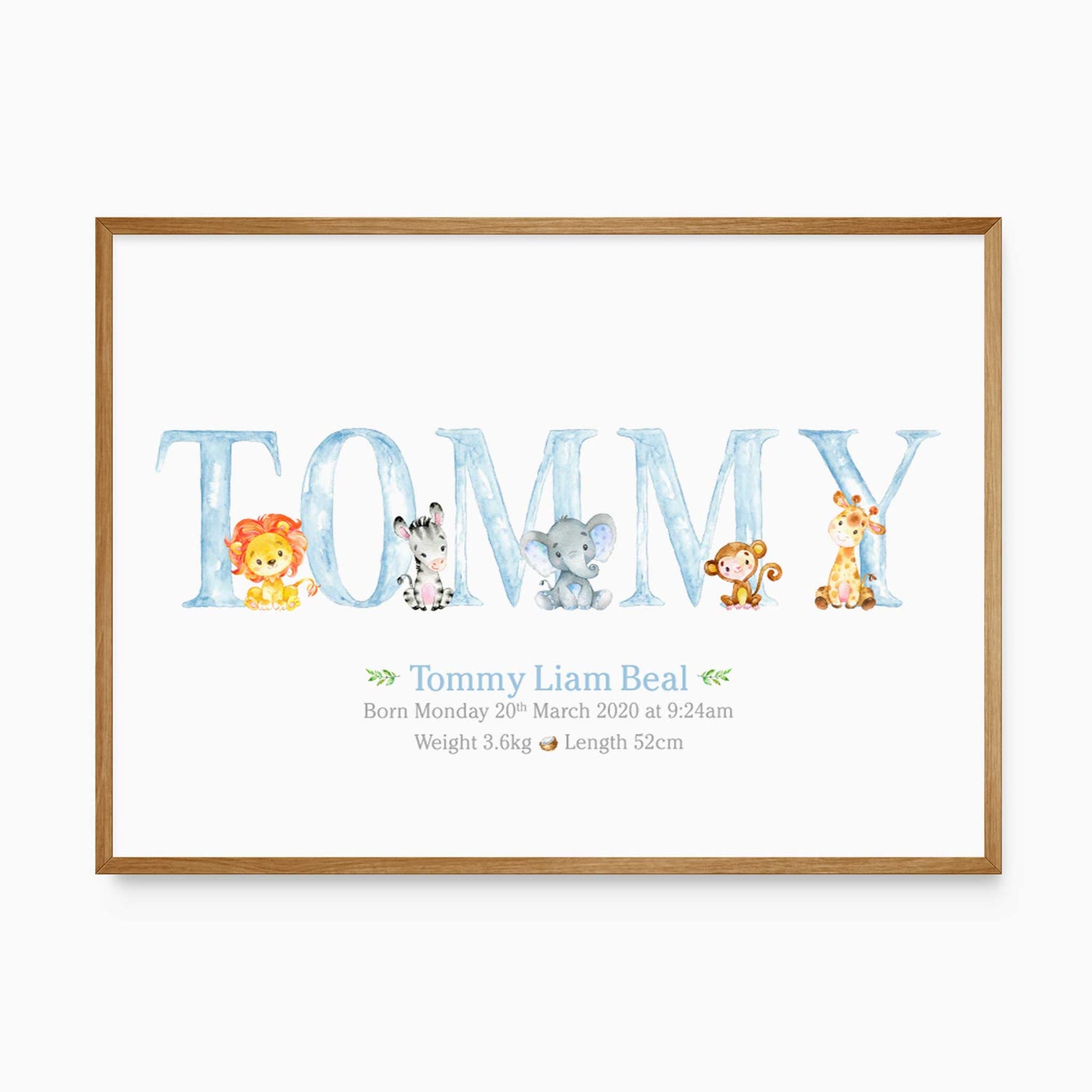 Personalised Safari Baby Boy Name Print - 5x7" Print is backordered and will ship as soon as it is back in stock.