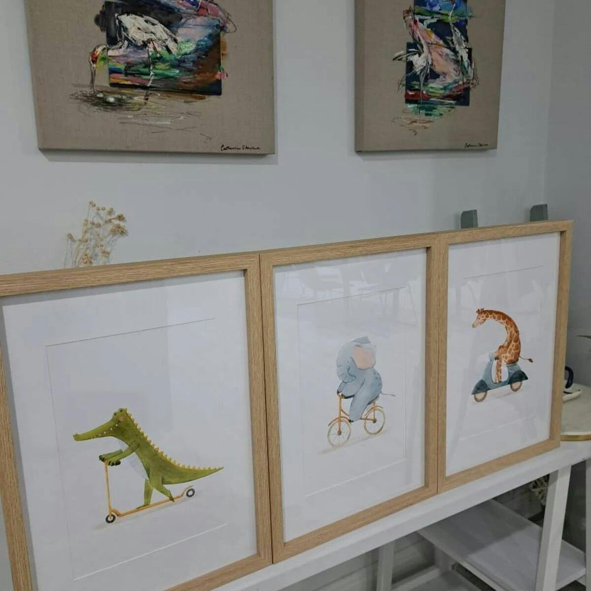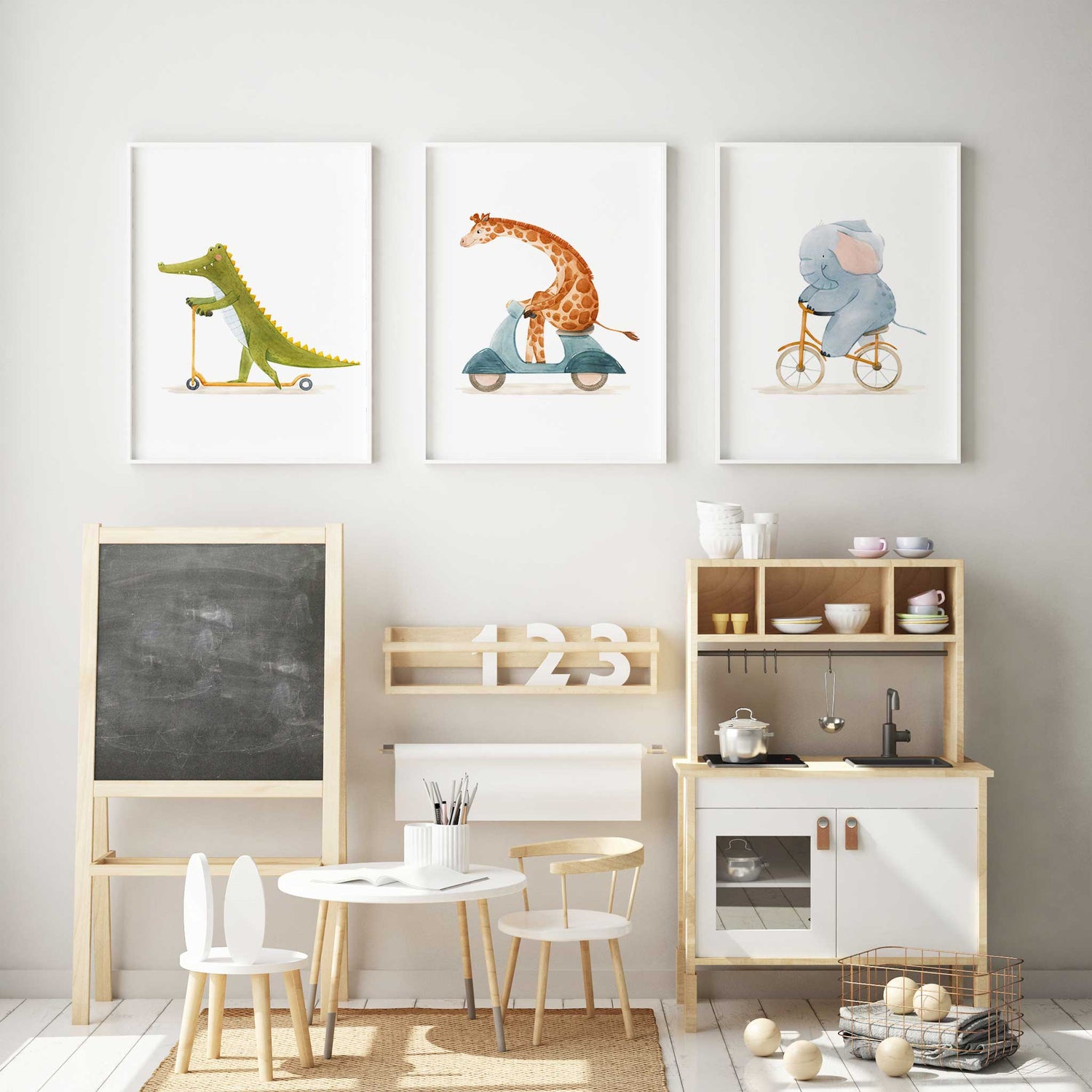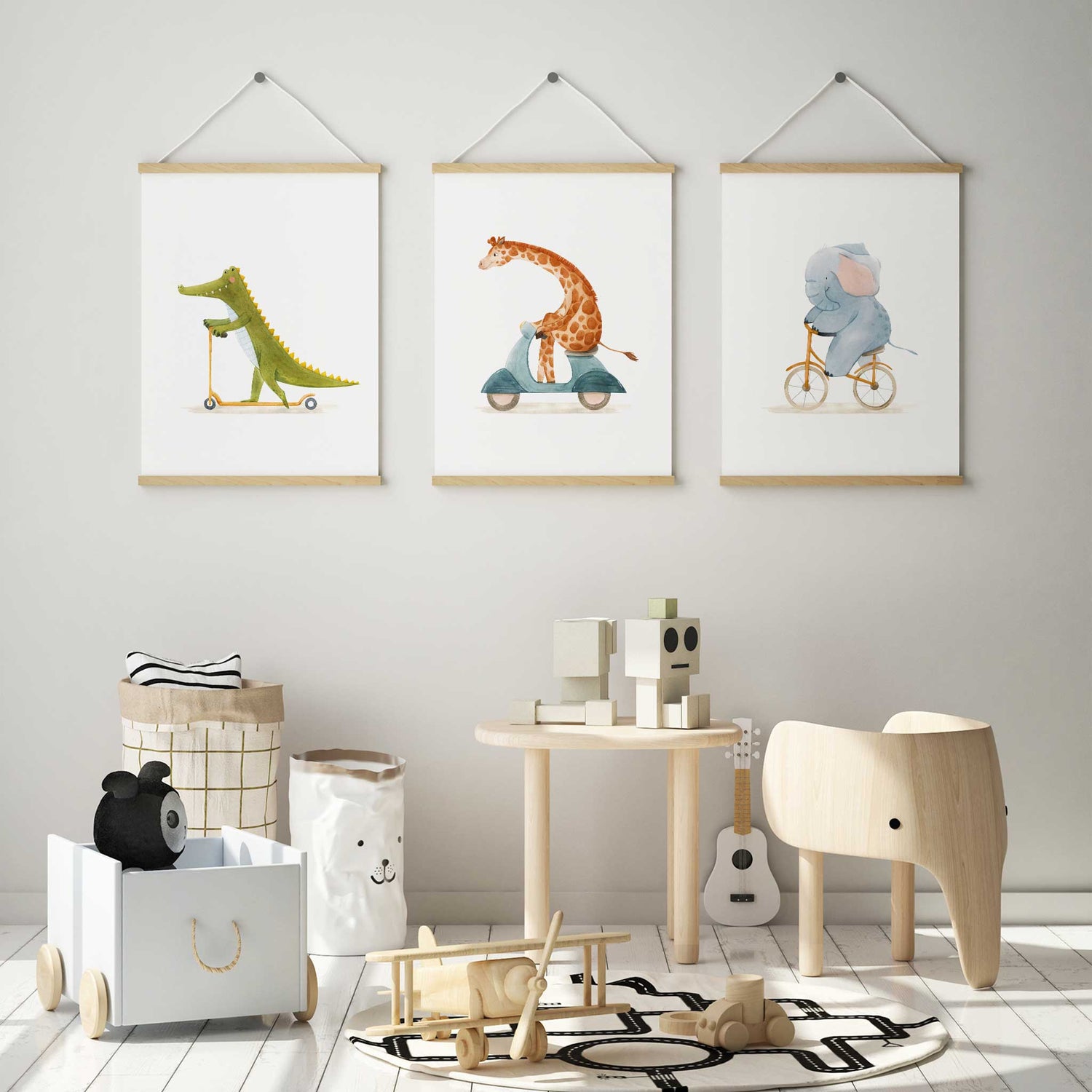 Create a playful feature wall with this charming set of three watercolour animal prints. A crocodile on a scooter, an elephant riding a bike and a giraffe on a vintage scooter make a sweet and imaginative trio for nurseries, bedrooms and playrooms. Soft colours suit boys and girls décor, blending beautifully with natural, modern and gender neutral styling.