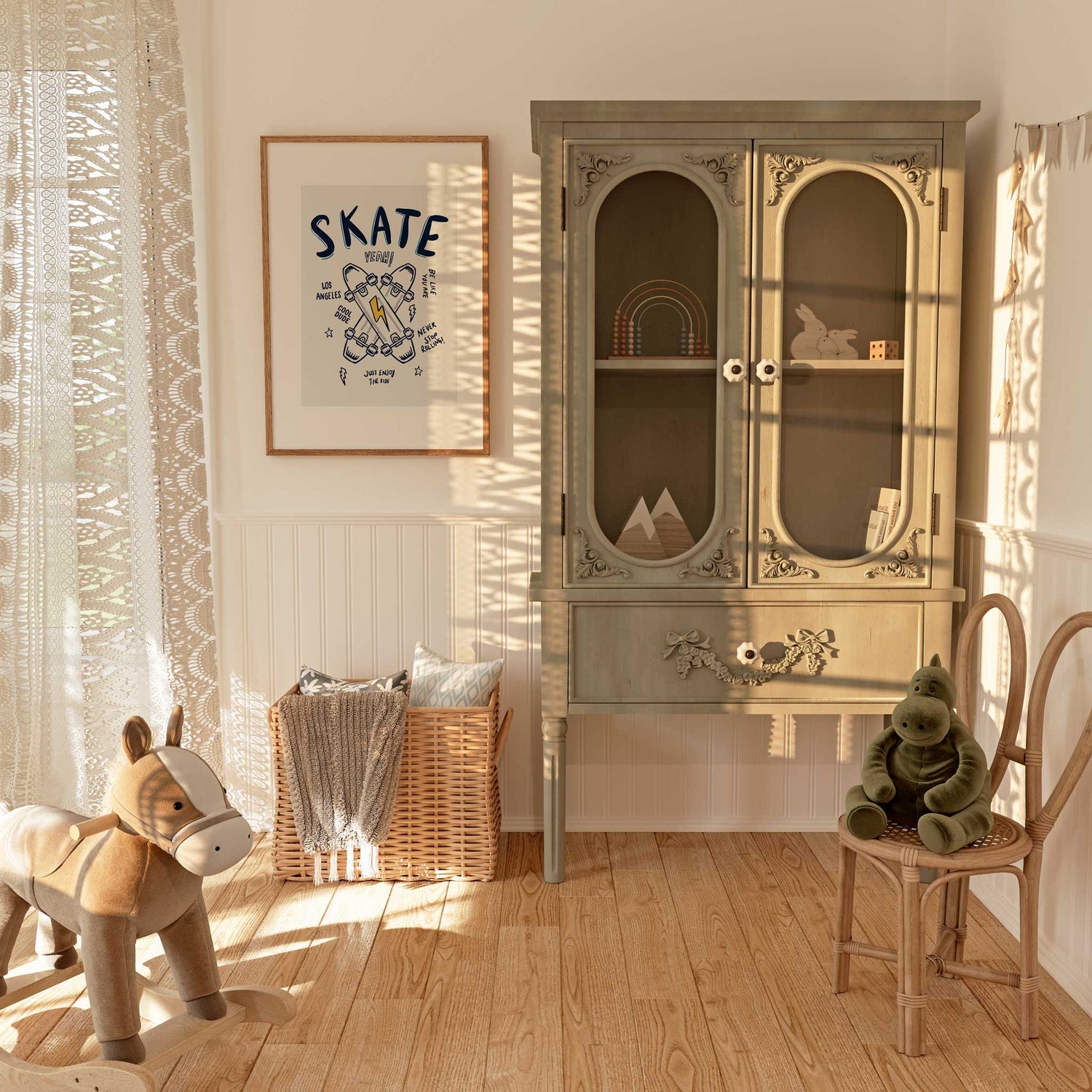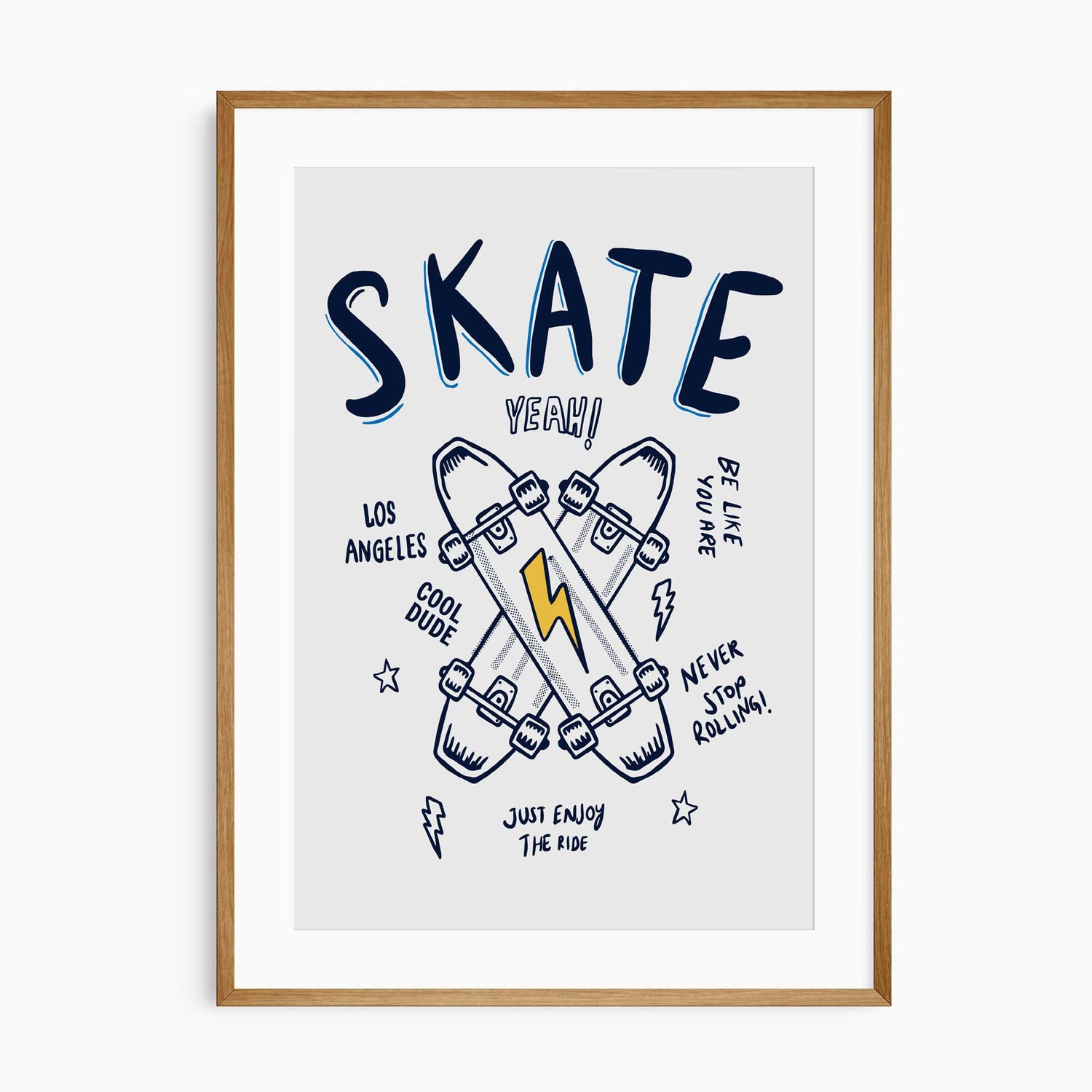 Skate Yeah Wall Art is the perfect cool-kid print for boys who love skateboards, lightning bolts and laid-back California vibes. With bold navy lettering on a grey background with a pop of yellow, this fun skate design brings energy and personality to any boys bedroom or playroom.