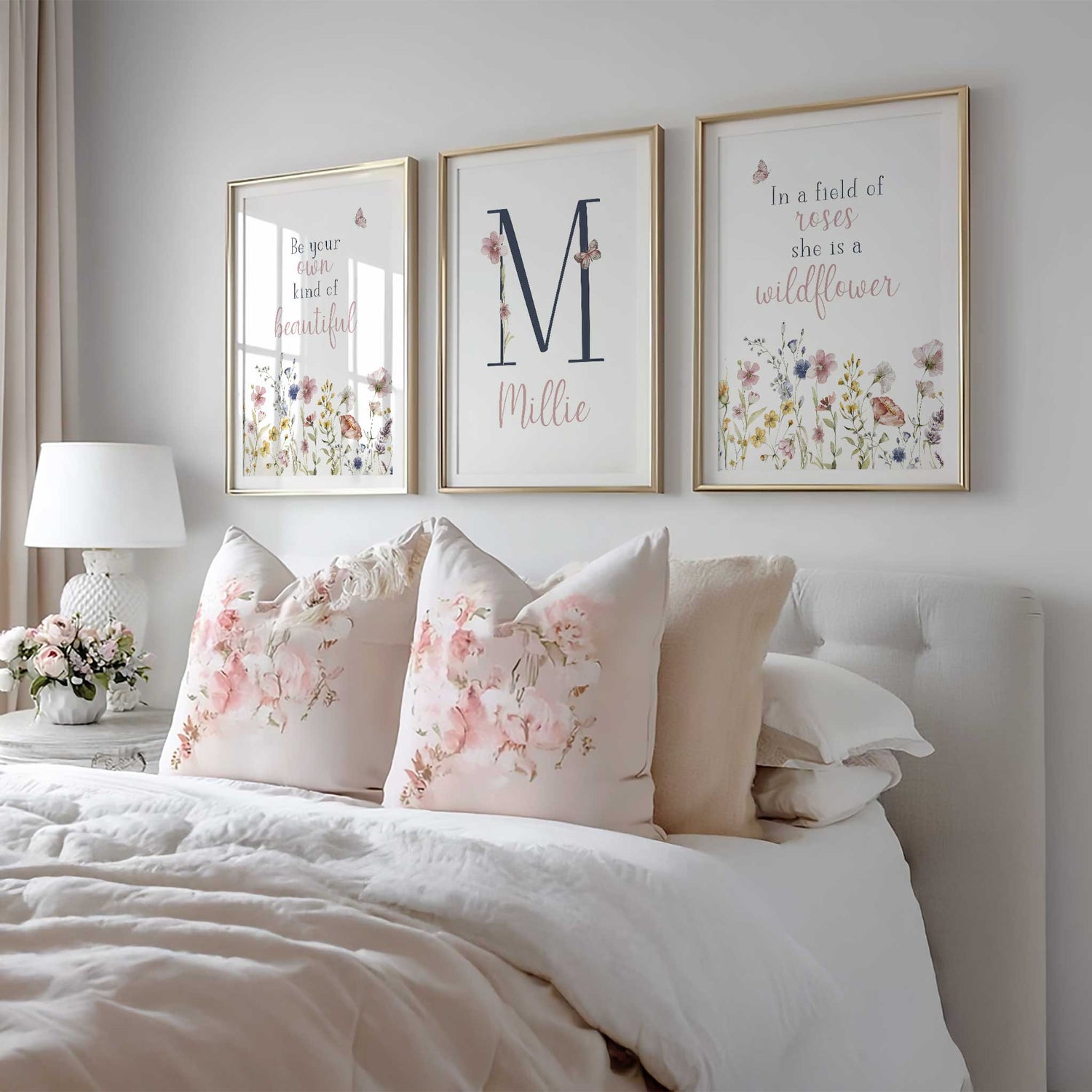 Soft floral wall art set for girls bedrooms and nurseries featuring two inspirational quotes and a personalised initial print. This three print collection includes gentle wildflowers, butterflies and custom name artwork to create a calm, beautiful space your child will grow with.