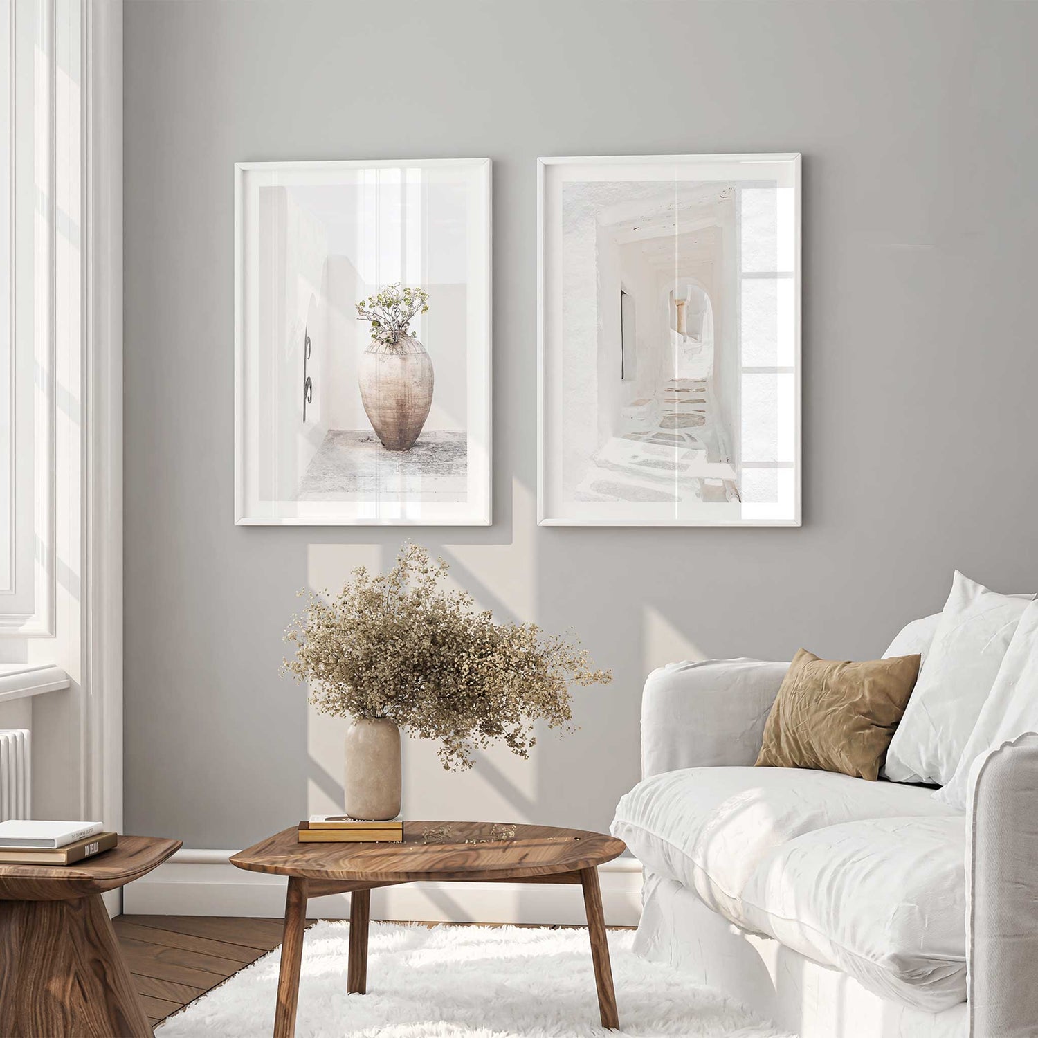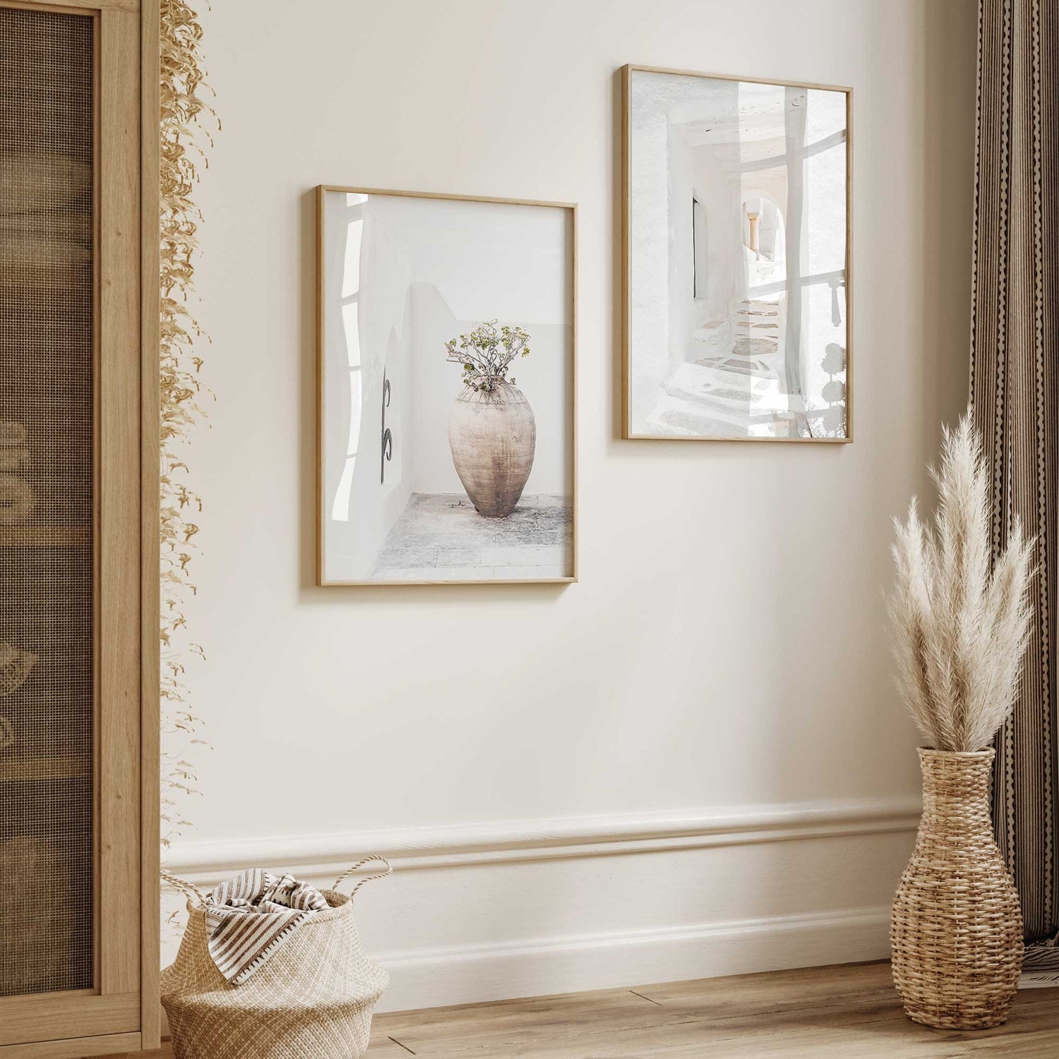 Bring the warmth and simplicity of the Mediterranean into your home with this set of two fine art prints. Featuring calming whitewashed architecture and rustic pottery, these artworks capture the timeless beauty of Greek island design. Perfect for creating a serene, minimalist look in living rooms, bedrooms, or entryways.