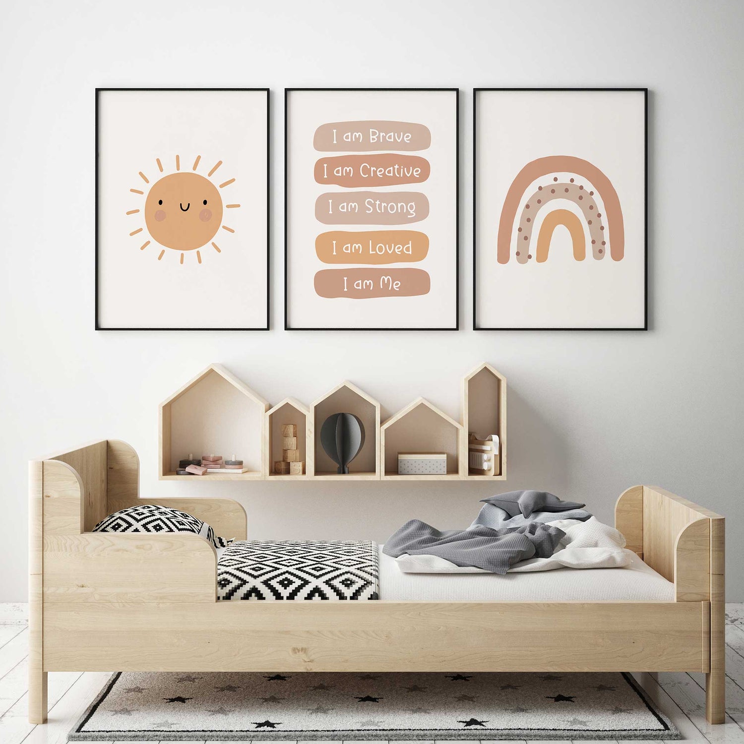 Create a warm and calming space for your little one with this terracotta-toned wall art set. This unframed trio features a happy sun, earthy rainbow, and custom affirmation print with your child’s name. With soft neutral shades and simple illustrations, this set brings modern boho vibes to any nursery, toddler room or play space.