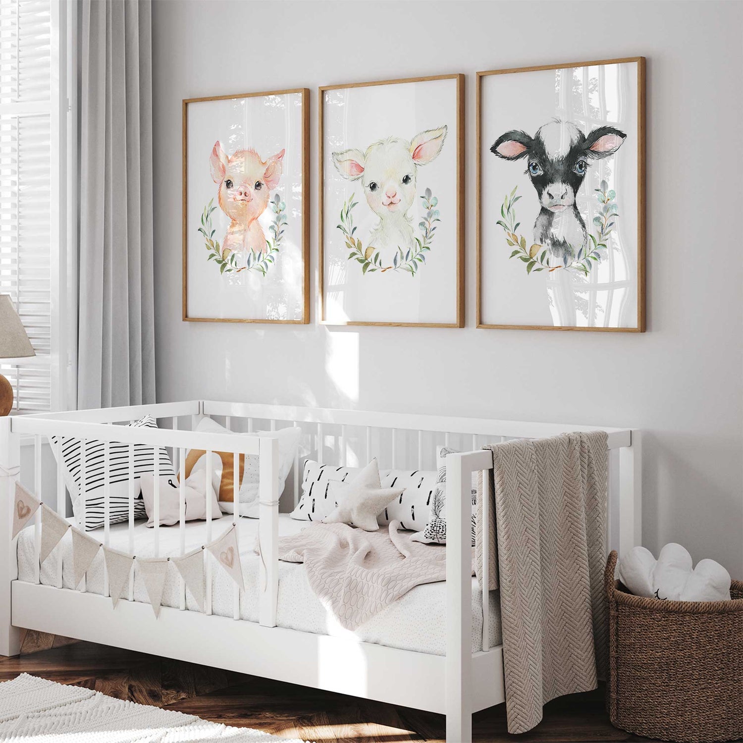 Create a soft and charming nursery with this set of three baby farm animal prints featuring a lamb, piglet and calf. Painted in gentle watercolour tones with delicate greenery, this artwork brings warmth and sweetness to baby rooms while keeping a calm neutral style perfect for modern nurseries.