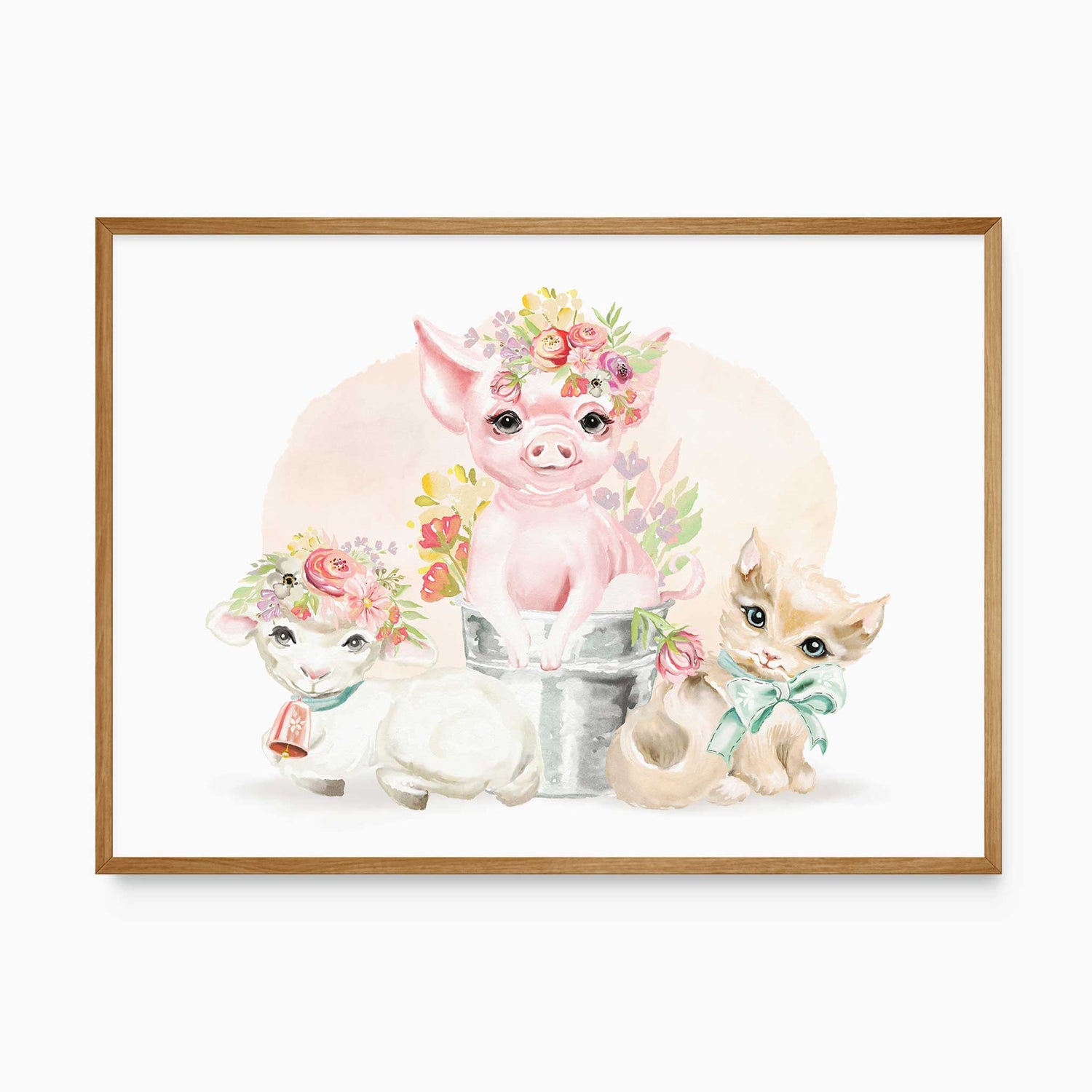 Add a sweet farmhouse touch to your little girls room with this charming animal wall art print. Featuring a piglet, lamb, and kitten wearing delicate floral crowns, this design is perfect for girls nurseries and baby bedrooms.