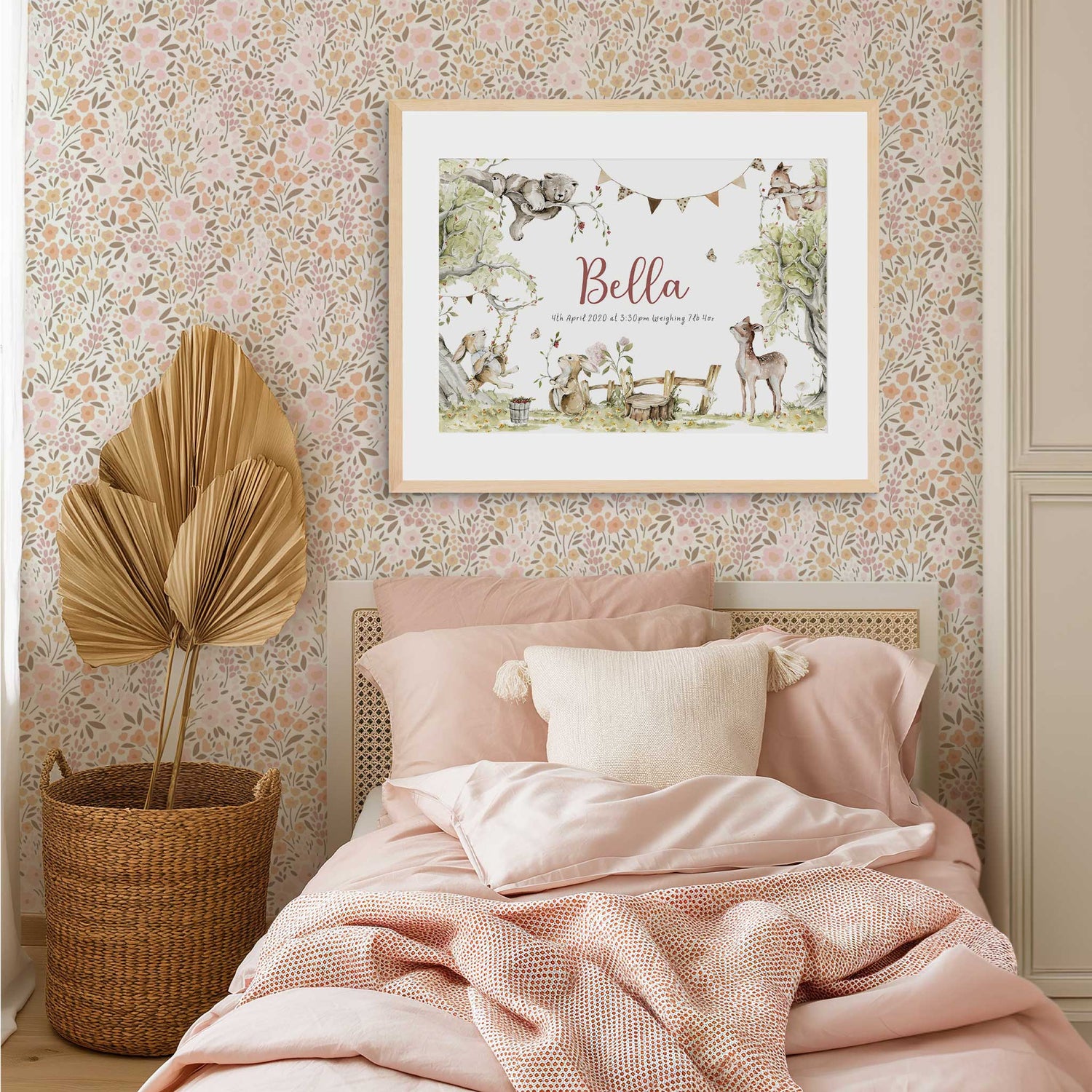 Create a soft woodland story around your child’s name with this beautifully illustrated personalised birth print. Featuring gentle forest animals, leafy trees, and bunting details, this design frames your child’s name and birth details in a calm, timeless style that suits nurseries and young children’s bedrooms.