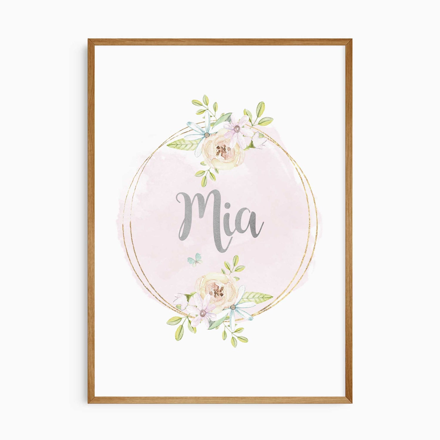 A soft set of three coordinating safari prints featuring a lion cub, an elephant, and a personalised name design. Each artwork is illustrated in gentle watercolour tones with delicate floral details, creating a calm and comforting look for a baby or young child’s room.