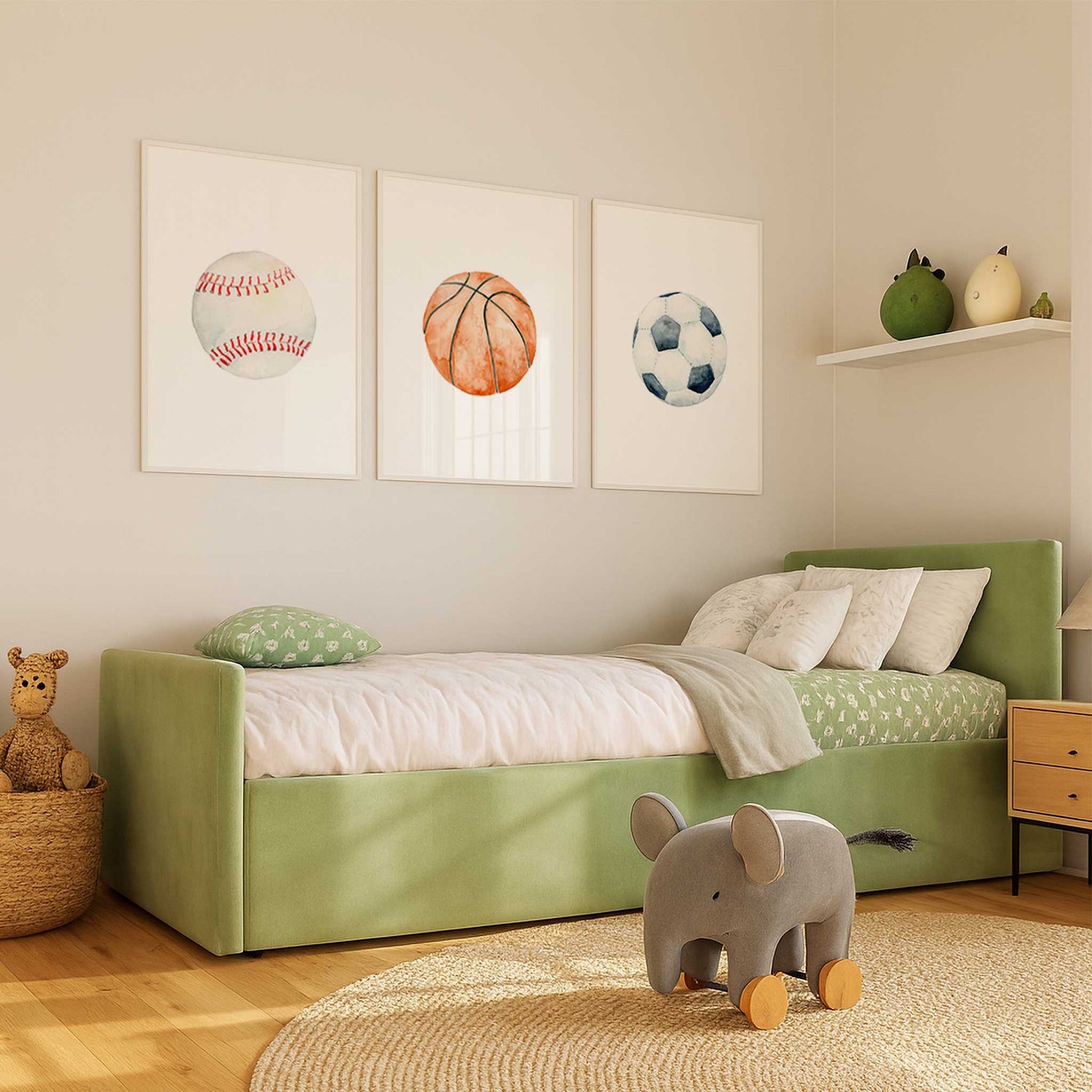 A playful and versatile wall art set for a sports-themed space, this set of 3 ball prints features soft watercolour artwork designed for a boys bedroom, playroom or nursery. With a clean, minimal look, these sports-inspired prints are easy to style and create a room that can grow with your child.