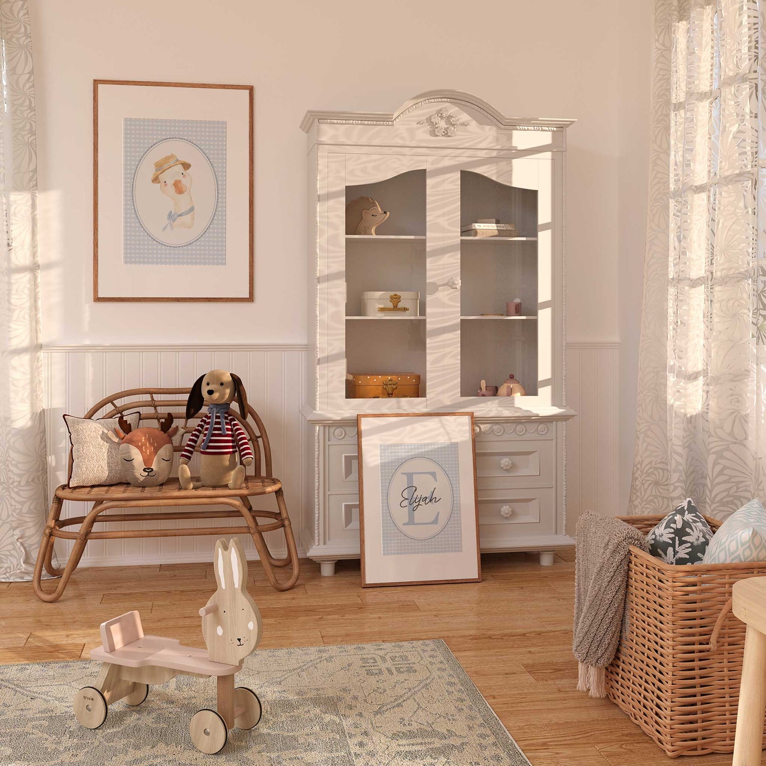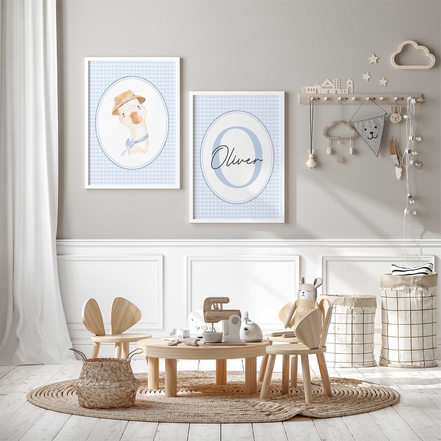 This personalised goose nursery print set adds a gentle storybook charm to your baby’s room. Featuring a sweet watercolour goose illustration and a custom initial name print, the set creates a calm and timeless wall display. The soft blue gingham background and oval frames give the artwork a vintage nursery feel that pairs beautifully with farmhouse, cottage, and classic baby boy nurseries.