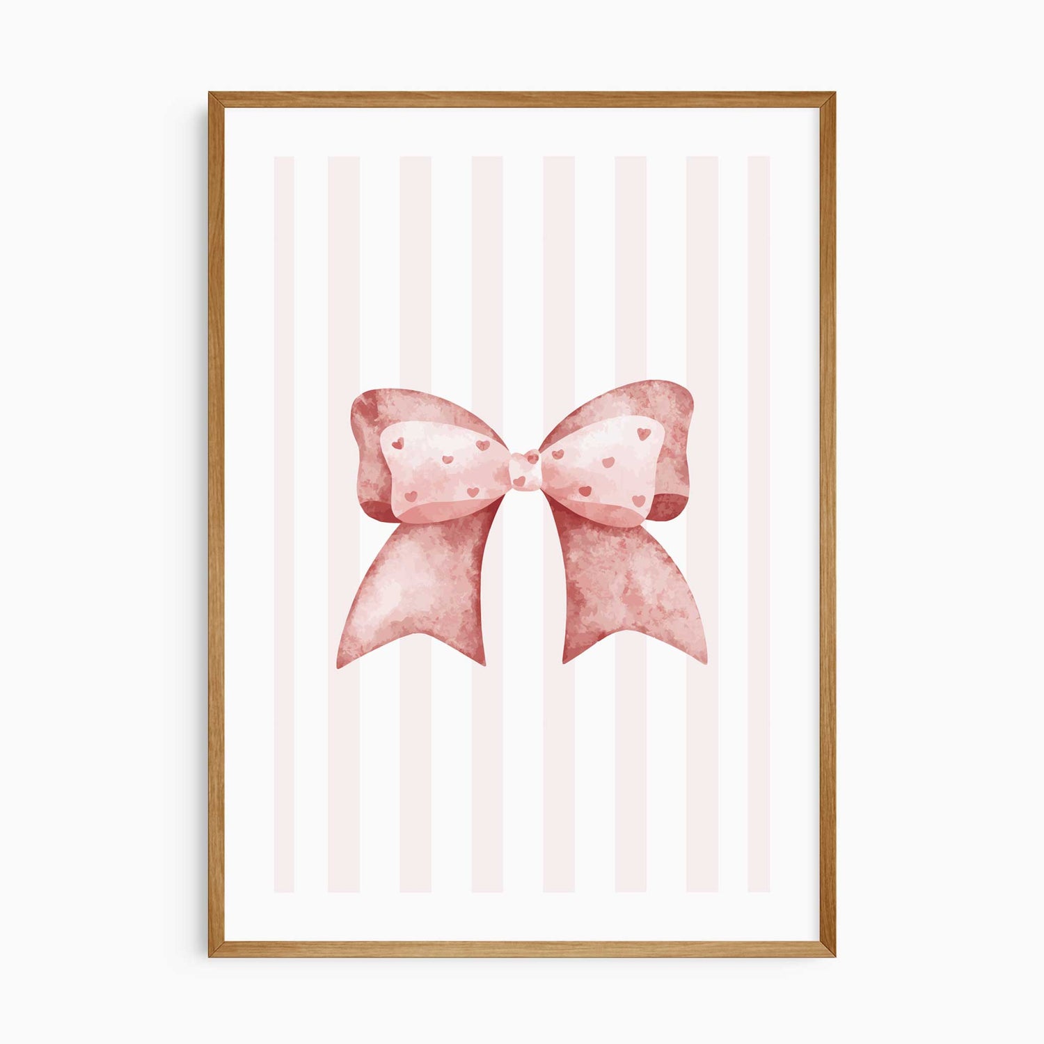 A sweet and feminine set of three pink bow wall art prints designed to bring soft colour and charm to a nursery, girls bedroom or playroom. Each artwork features a beautifully illustrated ribbon bow set against subtle striped backgrounds with a clean white border for a timeless, boutique style.